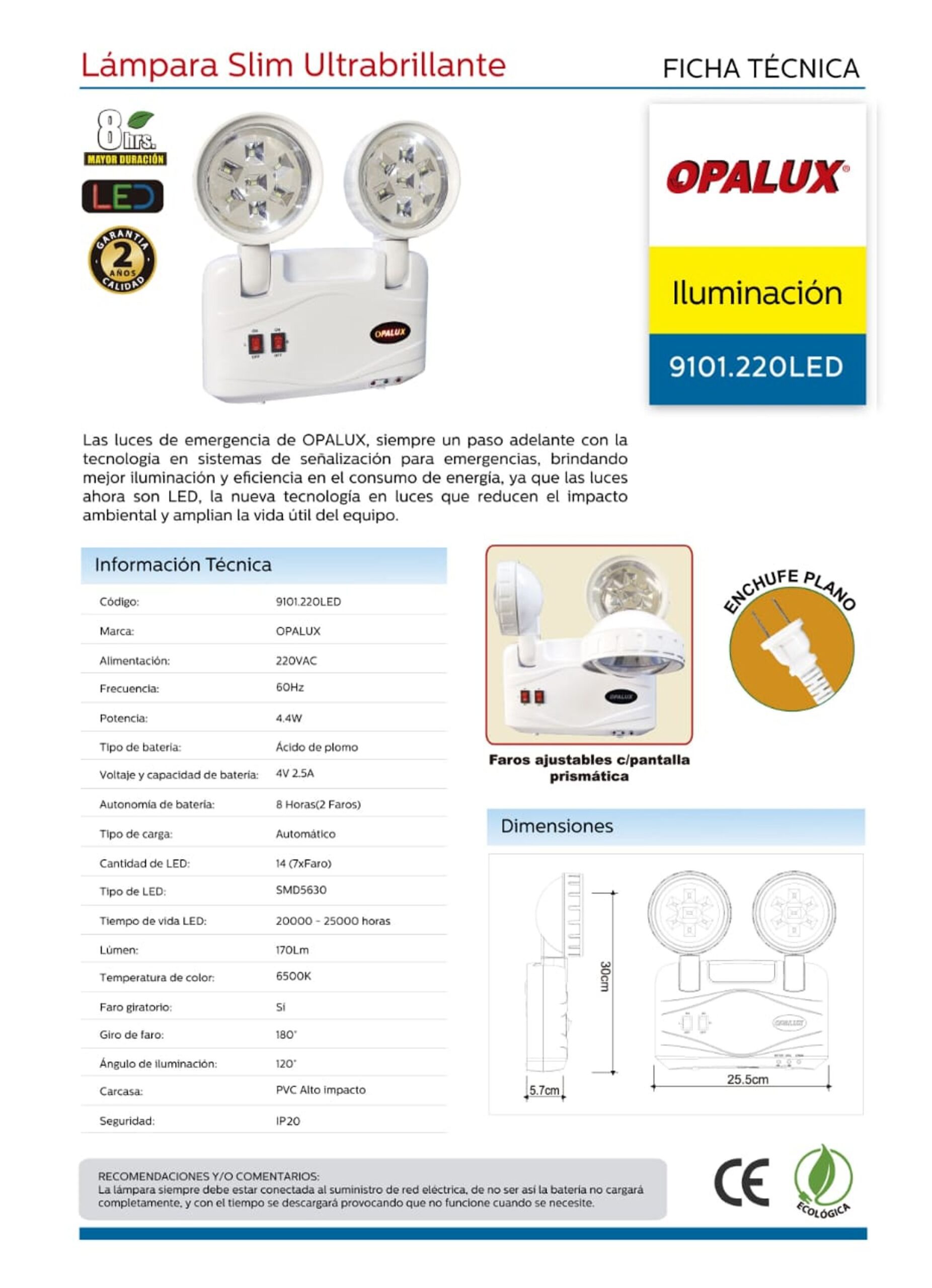 Las luces de emergencia de OPALUX, siempre un paso adelante con la tecnología en sistemas de señalización para emergencias, brindando mejor iluminación y eficiencia en el consumo de energía, ya que las luces ahora son LED, la nueva tecnología en luces que reducen el impacto ambiental y amplían la vida útil del equipo.